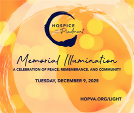 The Memorial Illumination events will feature a program with live music, reflective moments, and refreshments and are free and open to the public, regardless of Hospice of the Piedmont affiliation.